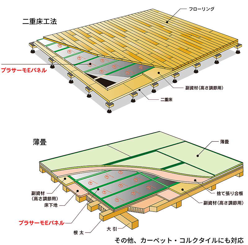 ヒーターと断熱材が一体型となったパネルタイプで、集合住宅・一般住宅・公共施設など、あらゆる住環境に対応します。また、インテリアに合わせてお好みの床仕上げ材をお選びいただけます。