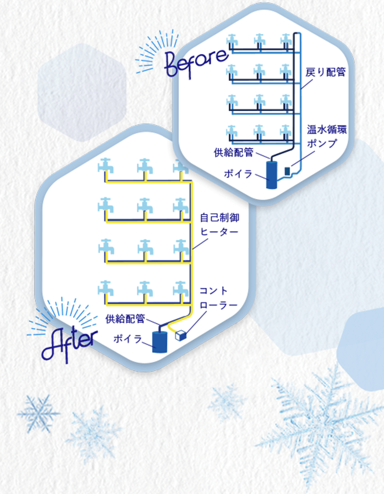 - 自己制御ヒーティング・ケーブルが放熱量を補完するため、従来の温水循環システムに比べ熱源機の運転時間が短縮します。